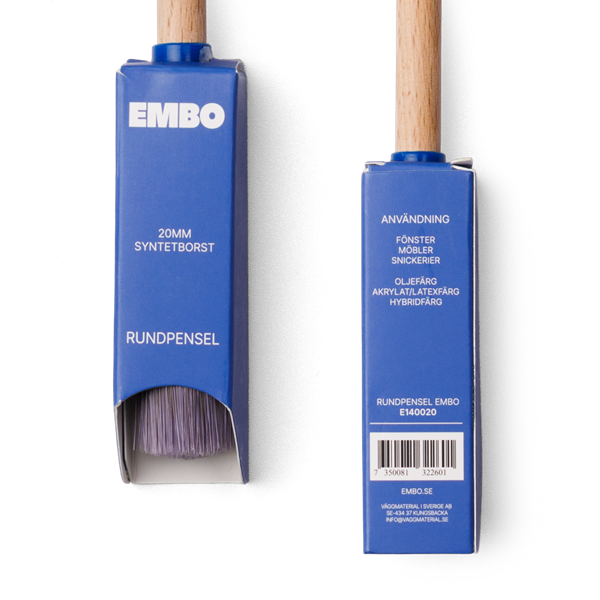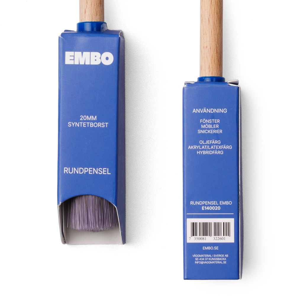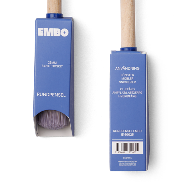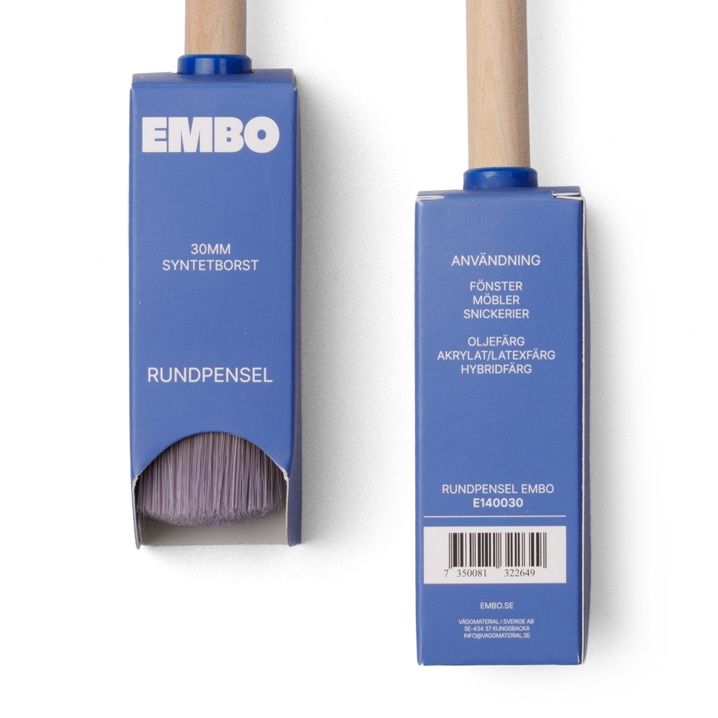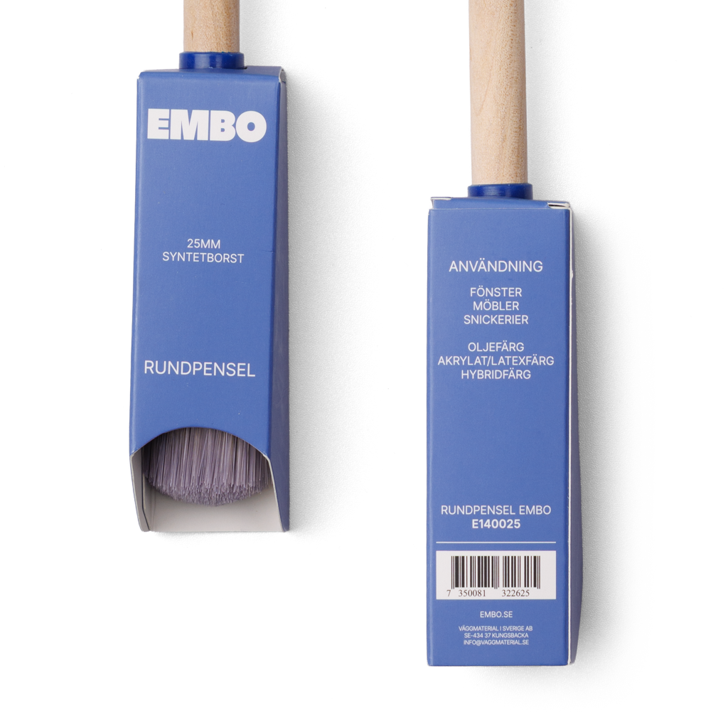 Träskaft, upplindbar. God färgupptagning och täckförmåga, mycket slitstark. Syntetborst utvecklad för vattenbaserad färg.